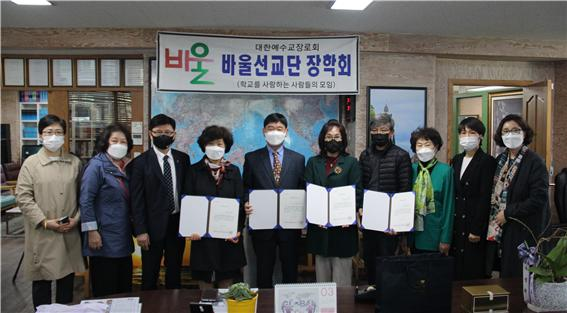 ▲장학금 전달식을 마친 후 수상자들과 장학회 관계자들이 기념 촬영을 하였다. 바울장학회 장학금 전달식이 지난 4월 5일 오후 2시 총회장실에서 있었다. 이날 장학금 수령자들과 바울 장학회 관계자들이 모여, 함께 잠시 담소를 나누고 바울장학회장 황경자 목사의 장학증서 수여 뒤, 정서영 총장의 격려가 있었다. 코로나19로 인한 방역 수칙을 지키기 위하여 체온 측정과 손 소독 등을 철저히 이행한 가운데 이날 장학 수혜자들과 바울선교단 관계자들이 서로 인사하고 바울 장학회를 널리 알려 줄 것을 당부하였다. 총회신학에서 장학생을 추천받아, 장학생 선발 위원회의 사전 검토 후 장학생으로 선출되어 한 학기 등록금 전액을 지원하는 바울장학회는 어려운 상황 속에서도 꾸준하게 장학금을 지급을 하고 있다. 이번 장학생에 선출 된 학생은 신학부 박용수, 홍용기 전도사가 연구원에 김말순 김에스더 전도사가 수령을 하였다.