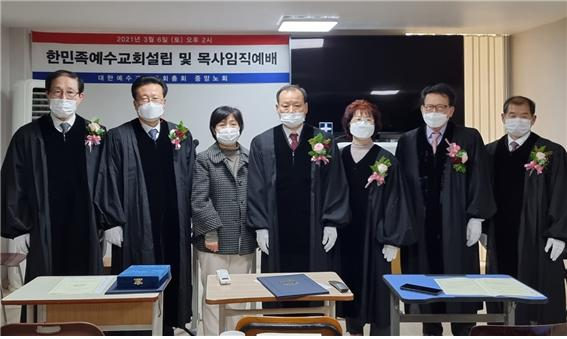 ▲예배를 마치고 에배 위원들과 기념 촬영을 하였다. 한민족예수교회 설립 및 목사 임직예배가 지난 3월 6일(토) 14:00시 경상남도 양산시 물금읍 서남1길 3에서 있었다. 이날 예배는 중앙노회 서기 박창근 목사의 인도로 이강자 목사(엘림기도원)가 기도를, 인도자가 성경본문 “마 6:33~34”절의 말씀을 봉독을 한 후 다 함께 찬양을 드리고 김재홍 목사(진실교회)가 ‘하나님 나라의 열매’라는 제목으로 말씀을 전하였다. 찬양을 부르며 드려진 예물을 위하여 김문기 목사(벧엘교회)가 봉헌 기도를 드렸다. 이어 목사 임직예배를 박창근 목사가 인도하여 임직을 받는 신철 강도사를 앞에 세워 오른선을 들어 서약을 하게 하였다. 신철 강도사에게 목사 가운을 착위 하게하고는 예배 위원들이 오른손을 얹어 안수기도를 한 후 악수례를 누눈 뒤 노회장 정서영 목사를 대신하여 서기 박창근 목사가 ‘대한예수교장로회합동개혁총회 중앙노회장인 나는 예수 그리스도께로부터 받은 직책과 교회의 권위를 가지고 대한예수교장로회합동개혁총회 중앙노회 신철 강도사가 2021년 3월 6일자로 목사가 된 것을 성부와 성자와 성령의 이름으로 공포합니다.’라고 공포를 하였고 회중은 “아멘”으로 화답하며 축하를 하였다. 이어 박창근 목사가 안수증과 안수 패를 전달을 하고, 이어 교회설립 선포 및 인정증서 전달식을 하였다. 박창근 목사는 ‘대한예수교장로회합동개혁총회 중앙노회장인 나는 예수 그리스도께로부터 받은 직책과 교회의 권위를 가지고 대한예수교장로회합동개혁총회 한민족예수교회가 경상남도 양산시 물금읍 서남1길 3에서 신철 목사를 담임교역자로해서 2021년 3월 6일 설립 되었음을 성부와 성자와 성령의 이름으로 선포합니다.’라고 선포를 하였고, 회중은 “아멘”으로 화답을 하며 한민족예수교회가 설립되었음을 축하를 하였다. 최공호 목사가 권면 및 축사를 한 뒤 신철 목사가 감사의 말씀을 전하였다. 다함께 찬양으로 하나님께 영광을 올려 드린 후 김재홍 목사의 축도로 예배를 마쳤다.