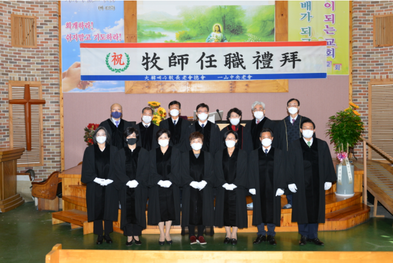 ▲임직자들(앞줄)과 안수위원들이 기념 촬영을 하였다. 일산중앙노회 목사 임직식이 지난 11월 6일(토)오전 11시 경기도 고양시 일산동구 숲속마을2로에 위치한 주사랑교회 예배당에서 있었다. 이날 예배는 김동수 목사(생명나무교회)가 인도하여 김문기 목사(벧엘교회)가 기도를, 정영호 목사(경기총신교회)가 성경본문 “행 4:12”절의 말씀을 봉독을 하였다. 총회장 정서영 목사가 ‘오직 예수’라는 제하의 말씀을 전할 때 모두가 “아멘”으로 화답을 하며 은혜를 나누었다. 정서영 목사는 말씀을 통하여 ‘낙엽이 물들어 떨어지는 가을의 정취를 맞보는 계절이다. 울긋불긋 형형색색으로 물드는 낙엽을 바라보며 우리는 참 이쁘다 아름답다 생각을 한다. 우리는 과연 그 낙엽들을 바라보며 진심 무슨 생각을 하는가? 자신의 색깔을 생각해 본 적이 있는가?’라고 반문을 하며 ‘우리는 진정 예수를 믿는 사람들로서 예수 그리스도의 색깔을 지니고 살아가고 있는가?’라고 물었다. 경기총회신학 학생들의 찬양가운데 드려진 예물을 위하여 김성종 목사(주사랑교회)가 봉헌 기도를 드린 후 임직식이 진행이 되었다. 일산중앙노회장 한서진 목사의 인도로 임직자들을 앞에 세워 오른손을 들어 서약을 하게하고, 안수위원들이 임직을 받는 강도사들에게 가운을 착용하게 하였다. 임직자들은 단위에 올라 무릎을 꿇어 안수를 받고, 안수위원들은 오른손을 얹어 안수하며 기도하였다. 안수위원들과 임직자들이 서로 악수례를 나누고, 노회장 한서진 목사는 ‘대한예수교장로회합동개혁총회 일산중앙노회장인 나는 예수 그리스도께로부터 받은 직책과 교회의 권위를 가지고 대한예수교장로회합동개혁총회 일산중앙노회 양정현 정용대 윤수경 박은자 원민자 조성자 나은주 강도사가 2021년 11월 6일자로 목사가 된 것을 성부와 성자와 성령의 이름으로 공포합니다.’라고 공포를 하였고 참석한 모두는 “아멘”으로 화답을 하며 임직을 받은 목사들을 축하 해주었다. 노회장 한서진 목사가 임직을 받은 일곱 명의 목사들에게 목사 안수증과 안수패를 전달을 하고 고영윤 목사(경기총신 교수)가 권면 및 축사를 한 후 임직자를 대표하여 양정현 목사가 감사의 인사말을 전 하였다. 다함께 찬양으로 하나님께 모든 영광을 올려 드린 후 총회장 정서영 목사의 축도로 일산중앙노회 목사 임직예배를 마쳤다.