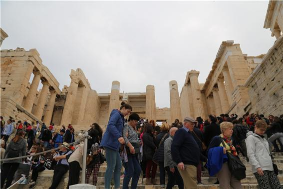 ▲파르테논 신전으로 오르는 입구 쪽 계단 수많은 인파로 발 디딜 곳도 마땅치가 않을 정도이다.