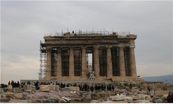 ▲파르테논 신전. 그리스 고전 건축의 가장 대표적인 건축물로 찬미되는 신전은 복원 공사가 한창이라 가까이 접근하는 것을 허락지 않는다. 파르테논 신전은 마라톤 전투(B.C. 490년)에서 그리스가 페르시아에 승리를 거둔 기념으로 여신 아테나를 칭송하기 위해 건립한 고대 그리스의 대표적인 신전 건축물이다. 파르테논이라는 신전의 명칭은 여신 아테나의 무녀들이 살았던 집인 파르테논(처녀의 집이라는 뜻이다)에서 유래했다.