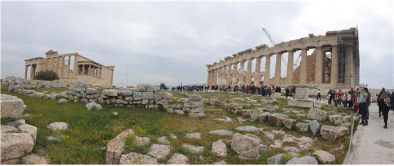 ▲파르테논 신전(우측)과 에렉테온 신전. 에렉테온 신전은 아테나 여신이 올리브 나무를 심었던 곳으로 아크로폴리스에서 가장 신성한 장소에 세워졌단다. 그리스 신화에 따르면 아테네를 놓고 경쟁을한 아테네 여신이 올리브 나무를 심고 그 자리에 바다의 신 포세이돈이 삼지창을 내리쳐 우물을 만든 곳에 전설의 왕 에렉토니우스의 이름을 따 에렉티온 신전이라 불렀다. |